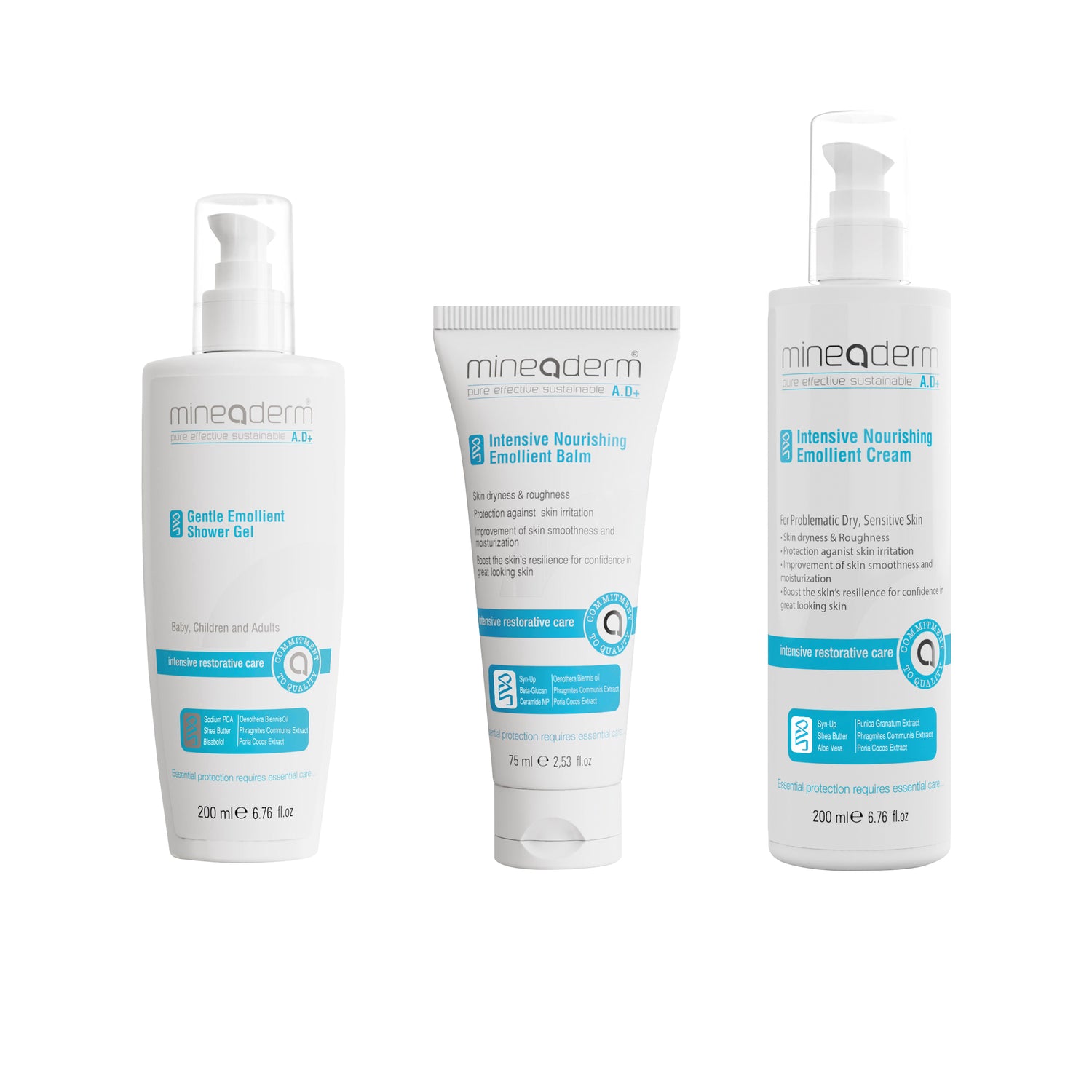 Mineaderm A.D+ Intensive Nourishing Emollient Cream; Shea Butter, SYN-UP kompleksi, Aloe Vera, Beta Glukan, Phragmites ve Poria Cocos ekstreleri gibi modern biyoteknolojik ve bitkisel içeriklerle formüle edilmiş, kuru ve çok kuru ciltlerde doğal nem dengesi ve konforu hızla geri kazandıran yenilikçi bir kremdir. Yağsız ve hafif yapısıyla anında emilir, yağlılık ve ağırlık bırakmadan cildi uzun süre yumuşatır ve korur; atopik ve hassas ciltlerde özel yatıştırıcı etki sağlar. Kullanıcılar, vücut ve yüz bölgelerinde yoğun kuruluk ve hassasiyet sorunlarının hızlıca azaldığını; bebek, çocuk ve yetişkinler tarafından güvenle kullanıldığını, cildin düzenli uygulamada sakinleşip “bir üst nem seviyesine” çıktığını ifade etmektedir. Parfüm, boya gibi tahriş riski taşıyan içerikler içermeyen; vegan ve cruelty-free sertifikalı bu krem, modern formülü sayesinde kuru ve reaktif ciltler için güvenli, akıllı ve sürdürülebilir bir bakım seçeneğidir